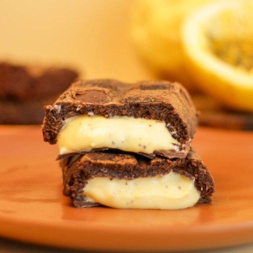 Brownie bem chocolatudo com recheio cremoso de mousse de maracujá. Doce na medida com aquele toque azedinho!