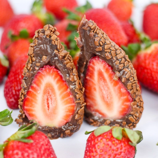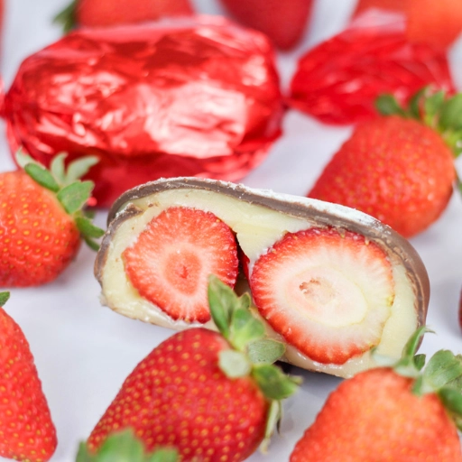 Morango enrolado no brigadeiro ao leite e split ao leite